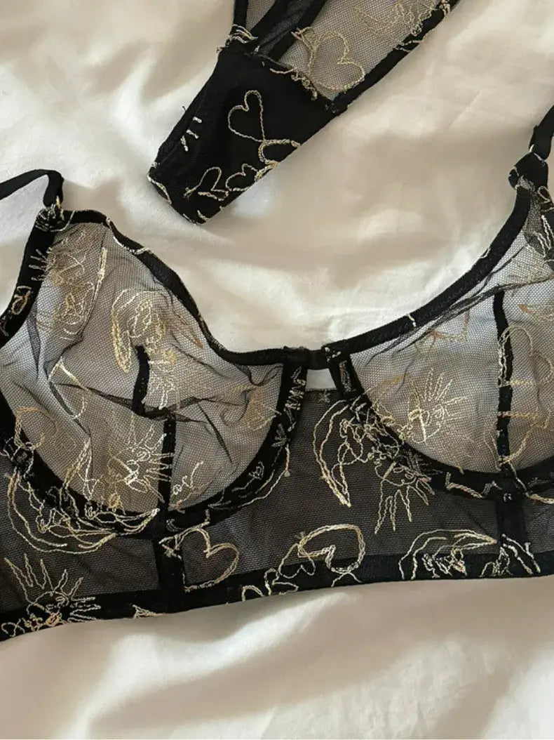 ✔ Dark, celestial, and sensual—this set blends gothic seduction with refined elegance. The black lace and shimmering gold thread create a dramatic contrast, perfect for confident, empowered styling. Ideal for both bedroom allure and fashion layering.